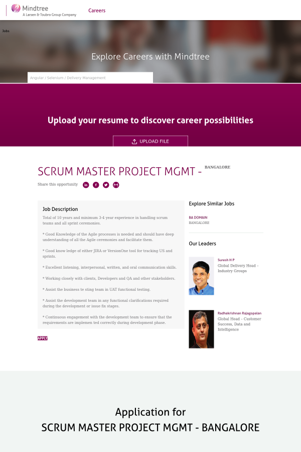 Scrum Master Project Management Job At Mindtree In Bangalore India 58438087 Tapwage Job Search